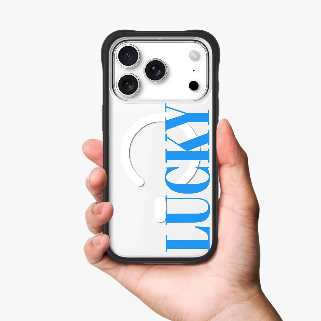 With minimalism as its core design language, this phone case features a high-transparency back panel paired with cool blue lettering, presenting a clean and crisp visual impact. The transparent texture allows the original beauty of the phone to be naturally revealed, while the eye-catching "LUCKY" lettering on the side injects a touch of personality and attitude into the overall design.